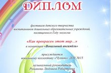 Сегодня вокальный ансамбль "Чулпан" под руководством музыкального руководителя Романовой Людмилы Робертовны награждена Дипломом в номинации "Вокальный ансамбль" за участие в Гала концерте Фестиваля детского творчества воспитанников дошкольных образовательных учреждений, посвященного Году экологии "Как прекрасен этот мир..."
