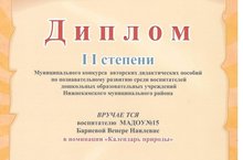 Воспитатель Бариева Венера Наилевна награждена Дипломом II степени за участие в муниципальном конкурсе авторских дидактических пособий по познавательному развитию среди воспитателей дошкольных образовательных учреждений Нижнекамского муниципального района. Венера Наилевна поздравляем Вас и желаем дальнейших успехов!