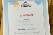 Ежегодно наши воспитанники принимают активное участие в республиканском конкурсе детских рисунков "Мой любимый дом" от "Домкор". Подведены итоги: дипломом победителя в номинации "Прогулка в моём городе" награждена Казбанова Таисия, педагог Нагимова А.Н. Остальные ребята награждены дипломами участника. Всем ребятам вручены памятные подарки. Поздравляем наших воспитанников и желаем им дальнейших творческих успехов и новых побед!
