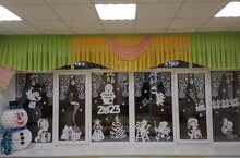 В предверии Нового года по доброй традиции украшаем окна. На оконных рамах детского сада оживают Дед Мороз и Снегурочка, символ года, снеговички и ангелочки. Дети и родители видят их ещё только на подходе к садику, и даже не зайдя в группу, заряжаются праздничным настроением.