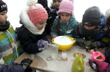 На прогулке дошкольники изучают свойства снега, льда. воды.