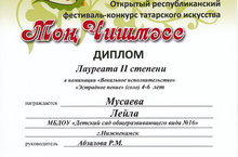 Воспитанница нашего детского сада Мусаева Лейла получила Диплом лауреата 2 степени в открытом Республиканском фестивале-конкурсе татарского искусства "Моң Чишмәсе", который проходил в городе Набережные Челны. Подготовила участницу музыкальный руководитель Абзалова Рамзия Мубашировна. ПОЗДРАВЛЯЕМ!!!