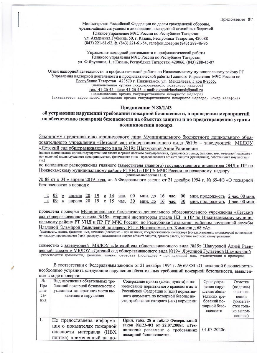 Предписание об устранении нарушений требований пожарной безопасности №88/143 от 09.04.2019