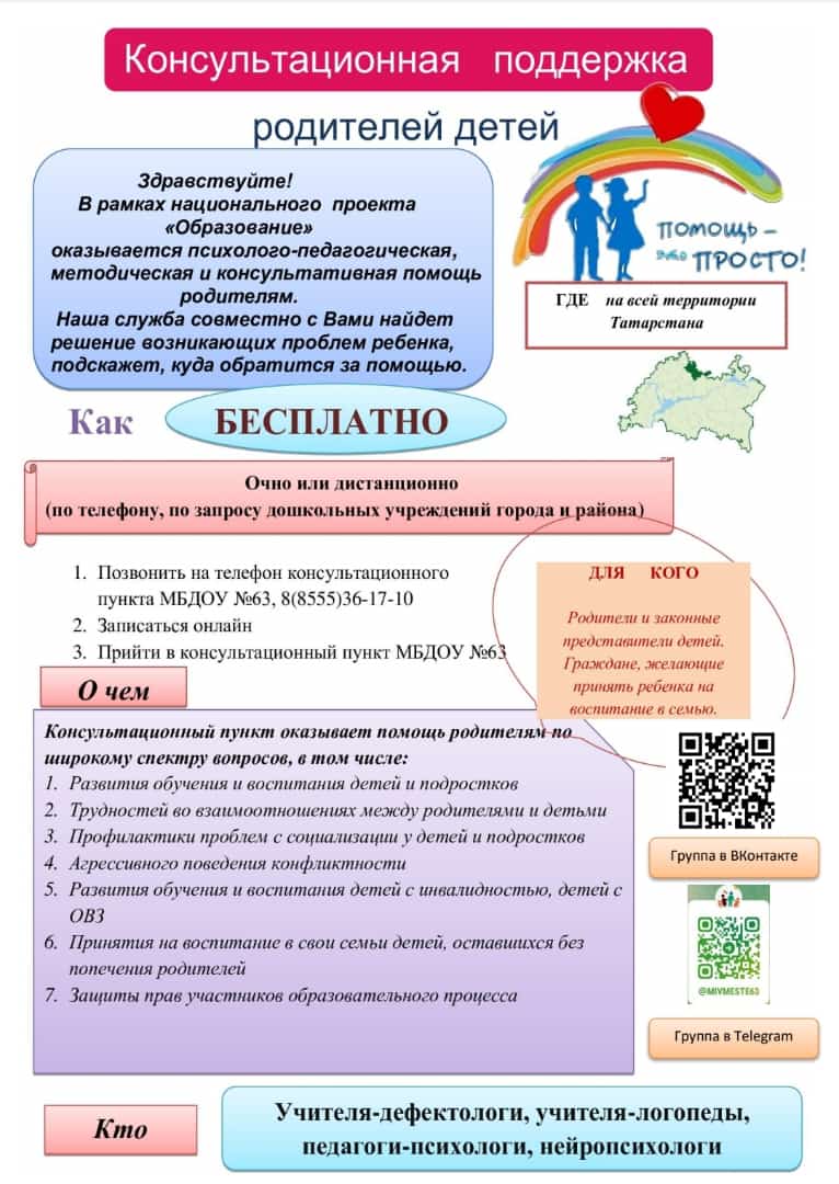 В детском саду №63 открыт консультационный пункт. Всех желающих специалисты (логопед, дефектолог, нейропсихолог, психолог) приглашают на консультации, беседы. Здесь вы получите ответы на все интересующие вас вопросы, касающиеся вашего ребенка (проблемы воспитания и обучения, питание и здоровье, подготовка к школе, домашние досуги и т.д.).