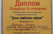 Районный фестиваль-конкурс патриотической песни "Песни, рождённые сердцем" прошёл на базе МАУ "Культурный центр"Чулман-Су" пгт Камские Поляны. Баяндин Риналь, воспитанник подготовительной к школе группы 6 и музальный руководитель Спиридонова Разия Хакимовна награждены Дипломом лауреата II степени в номинации: "Вокал-соло". 19.02.2022