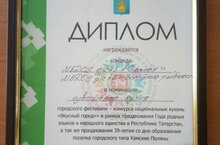 Городской фестиваль-конкурс национальных кухонь "Вкусный город" в рамках празднования Года родных языков и инародного единства в Республике Татарстан, а так же празднования 39-летия со дня образования пгт Камские Поляны. Команда награждена Дипломом в номинации "Чуваская кухня" 01.09.2021