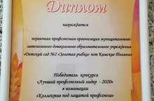 Муниципальный конкурс «Лучший профсоюзный лидер – 2020». Диплом победителя председателю профсоюзного комитета - Кочетовой Татьяне Евгеньевне - в номинации «Коллектив под защитой профсоюза». 24.09.2020