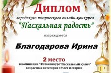 Городской творческий онлайн-конкурс "Пасхальная радость". Воспитатели: Терехина Наталья Ивановна - Диплом за 1 место в номинации "Фотоконкурс "Лучшая пасхальная поделка" и Благодарова Ирина Владимировна - Диплом за 2 место в номинации "Фотоконкурс "Пасхальный кулич". Поздравляем!!! " 20.04.2020