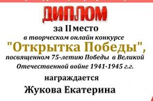 Городской творческий онлайн конкурс «Открытка Победы», посвященный 75-летию Победы в Великой Отечественной войне 1941-1945 г.г. Наши призеры: Кожевников Давид – Диплом за I место; Соковой Данил – Диплом за I место; Аппалонов Александр – Диплом за II место; Асхатова Алсу – Диплом за II место; Банников Антон – Диплом за II место; Жаркова Элина – Диплом за II место; Солецкий Родион – Диплом за II место; Жукова Екатерина – Диплом за II место; Лаврентьева Екатерина – Диплом за II место; Никитин Илья – Диплом за II место; Волкова Валерия – Диплом за II место; Зайнудинова Аиша – Диплом за III место; Галимова Ирада – Диплом за III место; Стрючкова Виктория – Диплом за III место; Царева Валерия – Диплом за III место; Царев Артем – Диплом за III место; Плаксин Кирилл – Диплом за III место; Стадниченко Елисей – Диплом за III место. Поздравляем наших воспитанников, родителей и воспитателей! 10.05.2020
