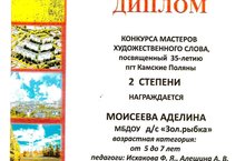 Конкурс чтецов и авторских стихотворений «И становится всё краше город молодости нашей!», посвященный 35-летию города Камские Поляны (на базе КЦ «Чулман Су» пгт Камские Поляны). Воспитанники старших групп №8,10 заняли призовые места: Моисеева Аделина – Диплом 2 степени; Хуснулгатина Азалия - Диплом 2 степени; Чугуев Константин – Диплом 3 степени. ПОЗДРАВЛЯЕМ!!! 20.04.2017