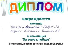 Спартакиада среди воспитанников ДОУ Нижнекамского муниципального района, в рамках месячника патриотического воспитания и в честь 35-летнего юбилея Камских Полян на кубок Главы муниципального образования "пгт Камские Поляны" НМР РТ. Команда "Вымпел" (воспитанники подготовительных к школе групп №11,12 и инструктора по физической культуре Кочетова Т.Е. и Касьянова Л.А.) награждены Дипломом Главы муниципального образования "пгт Камские Поляны" в номинации "За волю к победе". Поздравляем!!! 17.02.2017