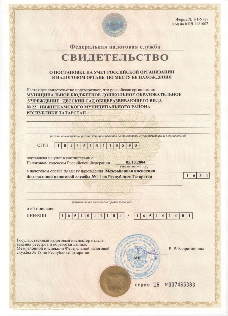 - Свидетельство о постановке на учёт Российской организации в налоговом органе по месту нахождения на территории Российской Федерации