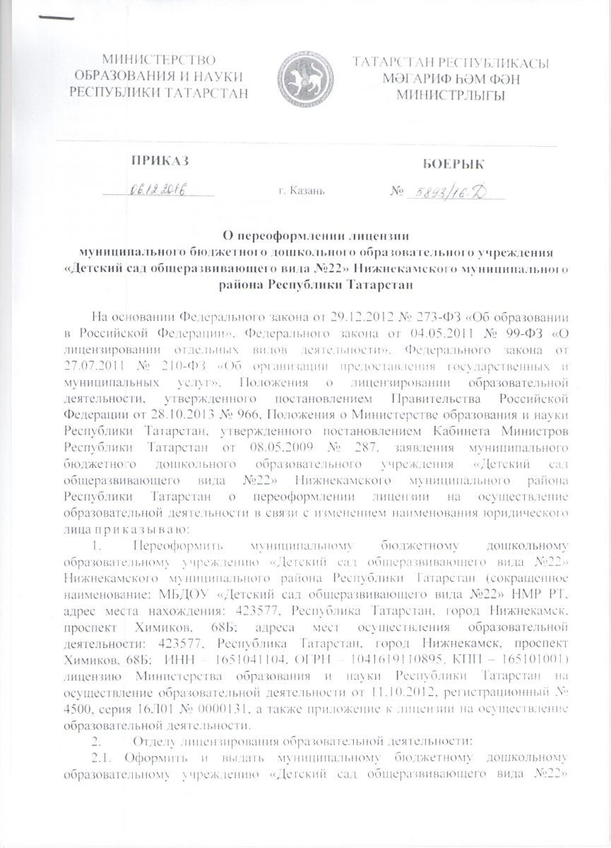 - Приказ о переоформлении лицензии на образовательную деятельность от 06.12.2016г. № 5893/16-Д