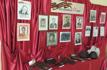 В холле детского сада в преддверии праздника Победы оформлен стенд "Бессмертный полк", где размещены портреты дедов сотрудников, участников ВОВ и экспозиции, предметы, использованные в годы войны.