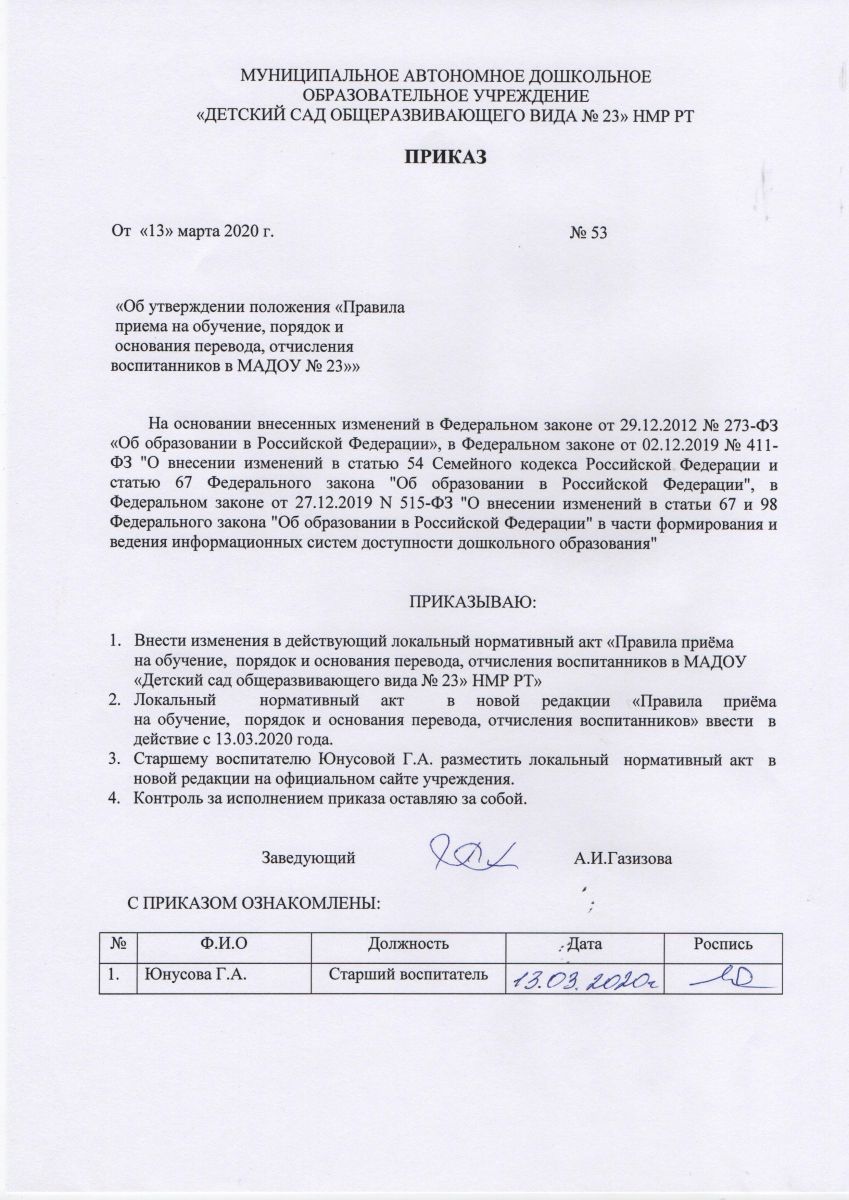 приказ об утверждении положения правила приема на обучение, порядок и основания перевода, отчисления воспитанников