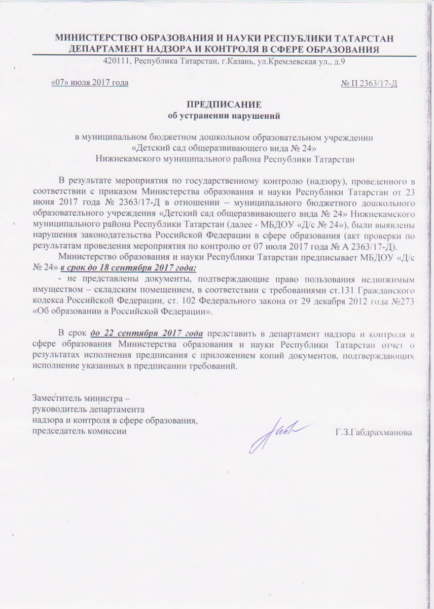 Предписание МОиН РТ об устранении нарушений от 07.07.2017 года № П 2363/17-Д