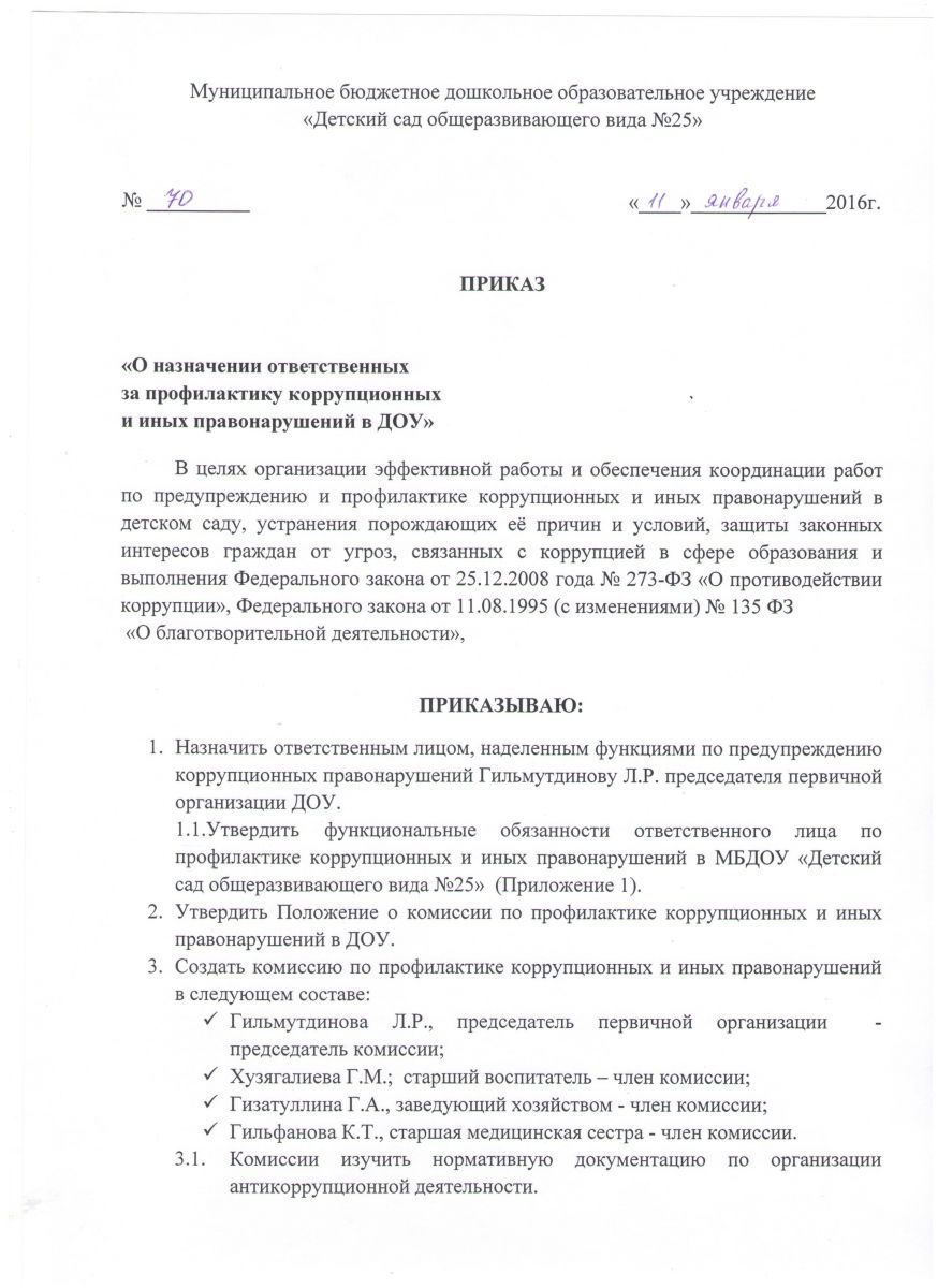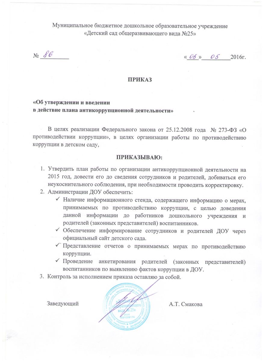 - Приказ об утверждении локальных актов о противодействии коррупции в ДОУ