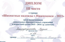 Воспитанница нашего детского сада - Хайрутдинова Гузель, приняла участие в турнире "Шахматные надежды г. Нижнекамск - 2023" среди воспитанников ДОУ в возрастной группе 2015-2016 г. р., где заняла 3 место.