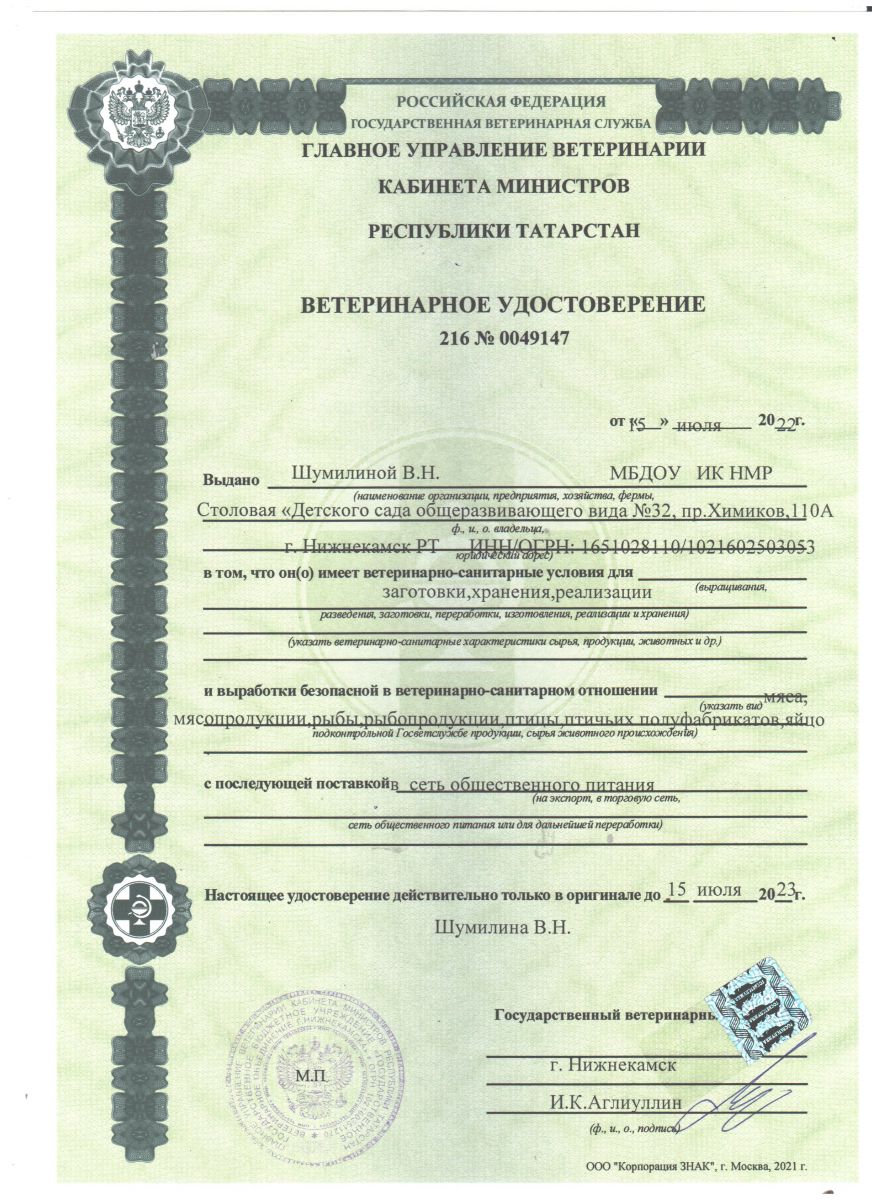 Ветеринарное удостоверение 216 № 0049147 от 15.07.2022
