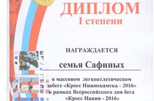 В массовых легкоатлетических стартах Всероссийского дня бега приняли участие 26 100 жителей Нижнекамского муниципального района, возраст - от четырёх до восьмидесяти двух лет (!). «Кросс Татарстана - 2016» собрал коллективы физкультуры школ, начального и профессионального образования, высших учебных заведений, предприятий и организаций города, на старт вышли люди с ограниченными физическими возможностями, ветераны спорта, руководители города и градообразующих предприятий. Дистанция протянулась по проспекту Химиков до проспекта Вахитова. Отдельно соревнования проводились в сельских поселениях и Камских Полянах.Дистанция протянулась по проспекту Химиков до проспекта ВахитоваПобедители и призёры в своих возрастных категориях были награждены медалями, кубками и дипломами. Участники специальных забегов получили сладкие призы.Предлагаем вниманию наших читателей список победителей.Самый младший участник – Халин Артемий (2012 г.р.)Самый взрослый участник – Сафеев Александр (1934 г.р.)Среди девочек до 18 лет и моложе:1 место – Загирова Алина (1999 г.р.)2 место – Маслова Диана (2001 г.р.)3 место – Батуева Юлия (2000 г.р.)4 место – Тачкулиева Гульнара (2002 г.р.)5 место – Чумакова Анна (2003 г.р.)6 место – Шайхутдинова Диляра (2001 г.р.)Среди девушек 18 лет и старше:1 МЕСТО – САФИНА АННА (1986 Г.Р.) УК «ТАТНЕФТЬ – НЕФТЕХИМ»- НАША РОДИТЕЛЬНИЦА2 место – Ишимова Алена (1992 г.р.) МБУ «УДМиС ИК НМР РТ»3 место – Мякина Светлана (1991 г.р.) АО «ТАНЕКО»4 МЕСТО – ДЕГТЯРЕВА ЕЛЕНА (1985 Г.Р.) УПРАВЛЕНИЕ МВД РОССИИ ПО НМР – наша родительница5 место – Ефремова Марина (1986 г.р.) МБОУ «СОШ №11»6 место – Бурханетдинова Раушания (1964 г.р.) ПАО «НКНХ»Среди юношей до 18 лет и моложе:1 место – Сибгатуллин Фанис (1999 г.р.)2 место – Ли Ранис (1999 г.р.)3 место – Карпов Эдуард (2000 г.р.)4 место – Михайлов Илья (1999 г.р.)5 место – Шарипов Ильдан (2000 г.р.)6 место –Бутянов Вячеслав (2000 г.р.)Среди юношей 18 лет и старше:1 место - Целых Владимир (1988 г.р.) АО «ТАНЕКО»2 место – Бурханетдинов Ринат (1998 г.р.) ОАО «ТАИФ –НК»3 место – Осипов Руслан (1987 г.р.) УК «Татнефть – Нефтехим»4 место – Алексеев Владимир (1990 г.р.) Тукаевский р-н5 место – Ворожцов Сергей (1971 г.р.) ПАО «НКНХ»6 место – Садретдинов Тагир (1998 г.р.) ГБПОУ «ННК»В ЗАБЕГЕ «СПОРТИВНАЯ СЕМЬЯ» ПОБЕДИЛА СЕМЬЯ САФИНЫХ ДЕТСКИЙ САД №33Подробнее: http://www.e-nkama.ru/news/249/46785/