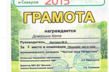 Поздравляем воспитанницу подготовительной группы №6 Демахину Катю и воспитателя Настину Марину Константиновну с призовым местом в муниципальном конкурсе "Чистые леса Татарстана", организованным управлением образования ИК НМР РТ и МБУ ДО "Детский эколого-биологический центр"