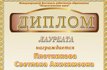 Поздравляем воспитателя высшей категории Плотникову Светлану Анисимовну с дипломом лауреата Международного фестиваля работников образования "Педагогические идеи"