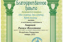 Поздравляем педагогов: Звереву О.С., Обшарову М.В.,Пермякову А.Л., Хаярову Р.Ф.,Лекомцеву Н.В.Махмутову Л.А., Сусяеву О.Н. Гайфуллину Н.Ш. и воспитанников Гайфуллина Эмиля, Никифорова Владислава,Токачеву Леру, Миргалимова Даниэля, Багатурия Егора, Хамитова Артура с победой в международной музыкальной викторине "Раз словечко, два словечко, будет песенка..."