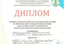 Воспитатель нашего детского сада Ёлкина Людмила Николаевна была награждена дипломом в номинации "Работа с родителями " за участие в конкурсе на лучшую разработку дидактических игры "Весёлые кубики" по обучению детей двум государственным языкам . по учебно-методичекому комплекту "Говорим по-татарски" среди ДОУ г.Нижнекамска.