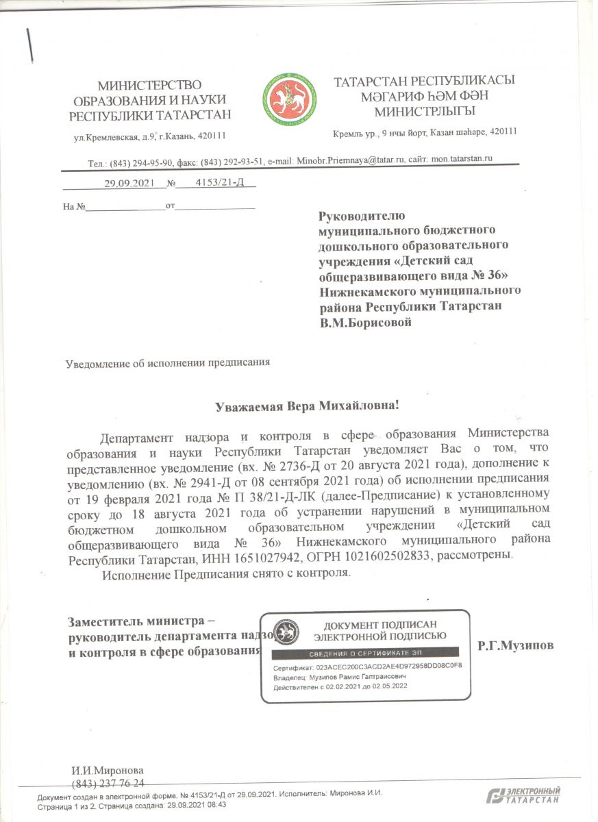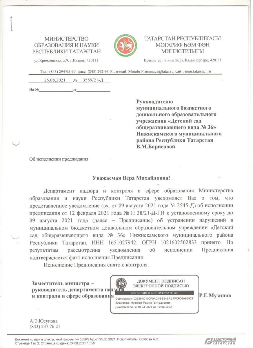 Ответ о снятии с контроля предписаний Министерства образования и науки Республики татарстан Департамента надзора и контроля в сфере образования