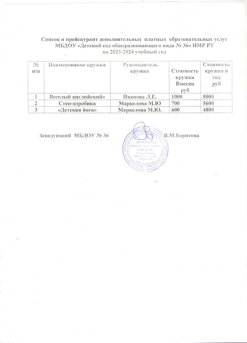 Список дополнительных платных образовательных услуг на 2023 -2024 учебный год и прейскурант