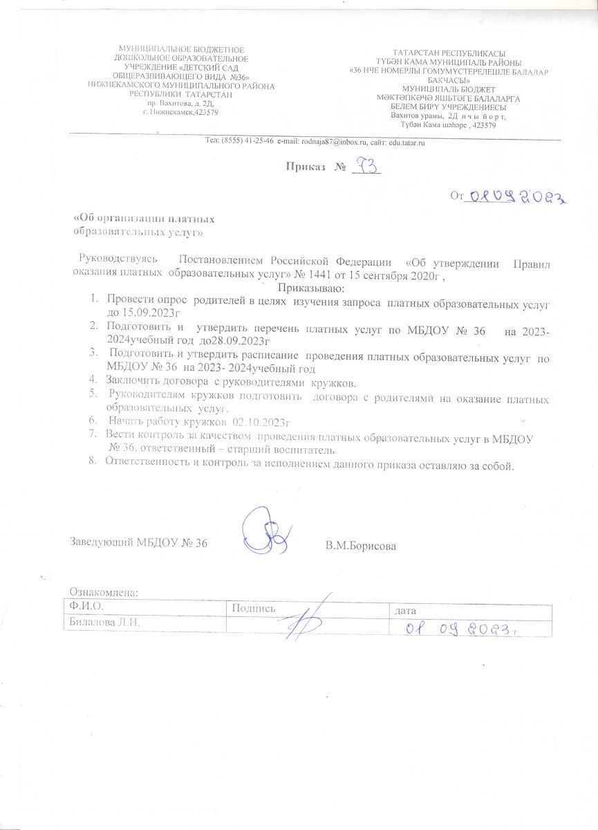 Приказ о проведении платных образовательных услуг на 2023-2024 учебный год
