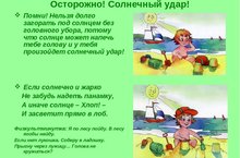 Уважаемые родители! Лето – очень жаркое время года. Просим Вас соблюдай питьевой режим ребенка и обязательно головной убор. Солнечный и тепловые удары – состояние, возникающее в результате перегрева организма. Напоминаем, что при отсутствии головного убора у ребенка, вам может быть отказано в прогулке на свежем воздухе.
