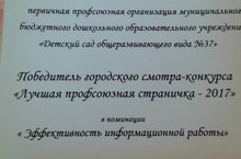 Наш детский сад стал победителем в городском смотре-конкурсе «Лучшая профсоюзная страничка – 2017» и награжден Дипломом первичной профсоюзной организации в номинации «Эффективность информационной работы».
