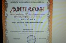 Наш детский сад принял участие в Ассоциации творческих педагогов России при поддержке Министерства Образования и науки РФ и был награжден ДИПЛОМОМ лауреата рейтинга ТОП-500 образовательных организаций в номинации " Лучшие условия для обмена педагогическим опытом и профессионального развития".