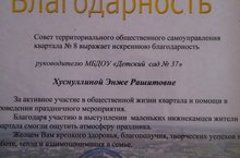 23 августа по улице Тихая аллея 5 прошел праздник, посвященное открытию Двора, в котором приняли участие жители близлежащих домов. Руководителю нашего детского сада Хуснуллина Эндже Рашитовна объявили и вручили Благодарность за активное участие в общественной жизни квартала и помощи в проведении праздничного мероприятия.