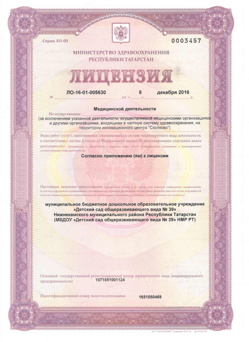 Муниципальное бюджетное дошкольное образовательное учреждение «Детский сад общеразвивающего вида №39" Нижнекамского муниципального района Республики Татарстан