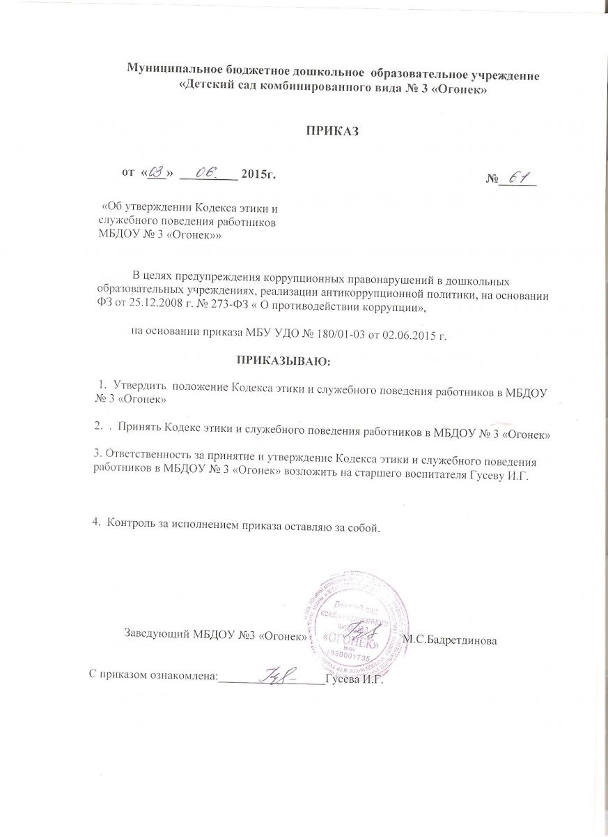 Приказ об утверждении Кодекса этики и служебного поведения работников