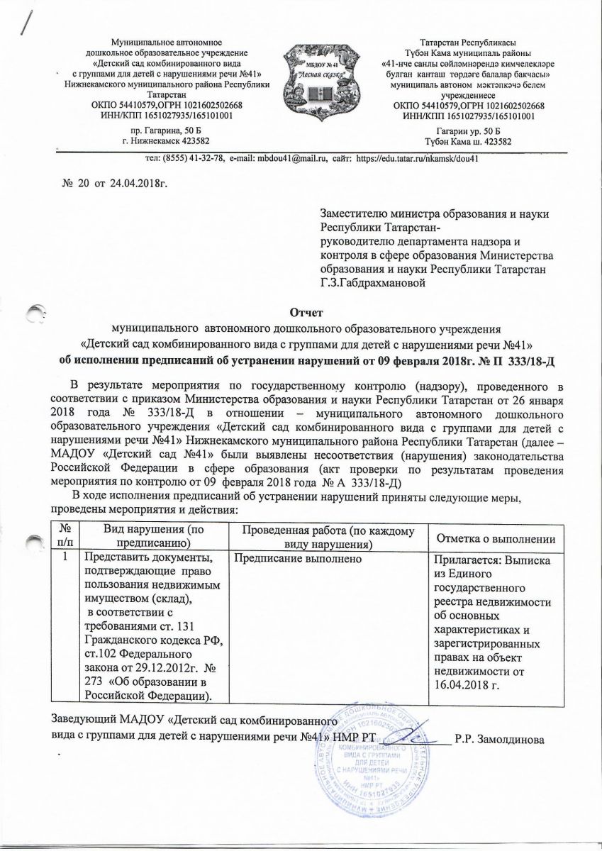 - Отчет о выполнении предписания Департамента надзора и контроля в сфере образования МОиН РТ 2018г.