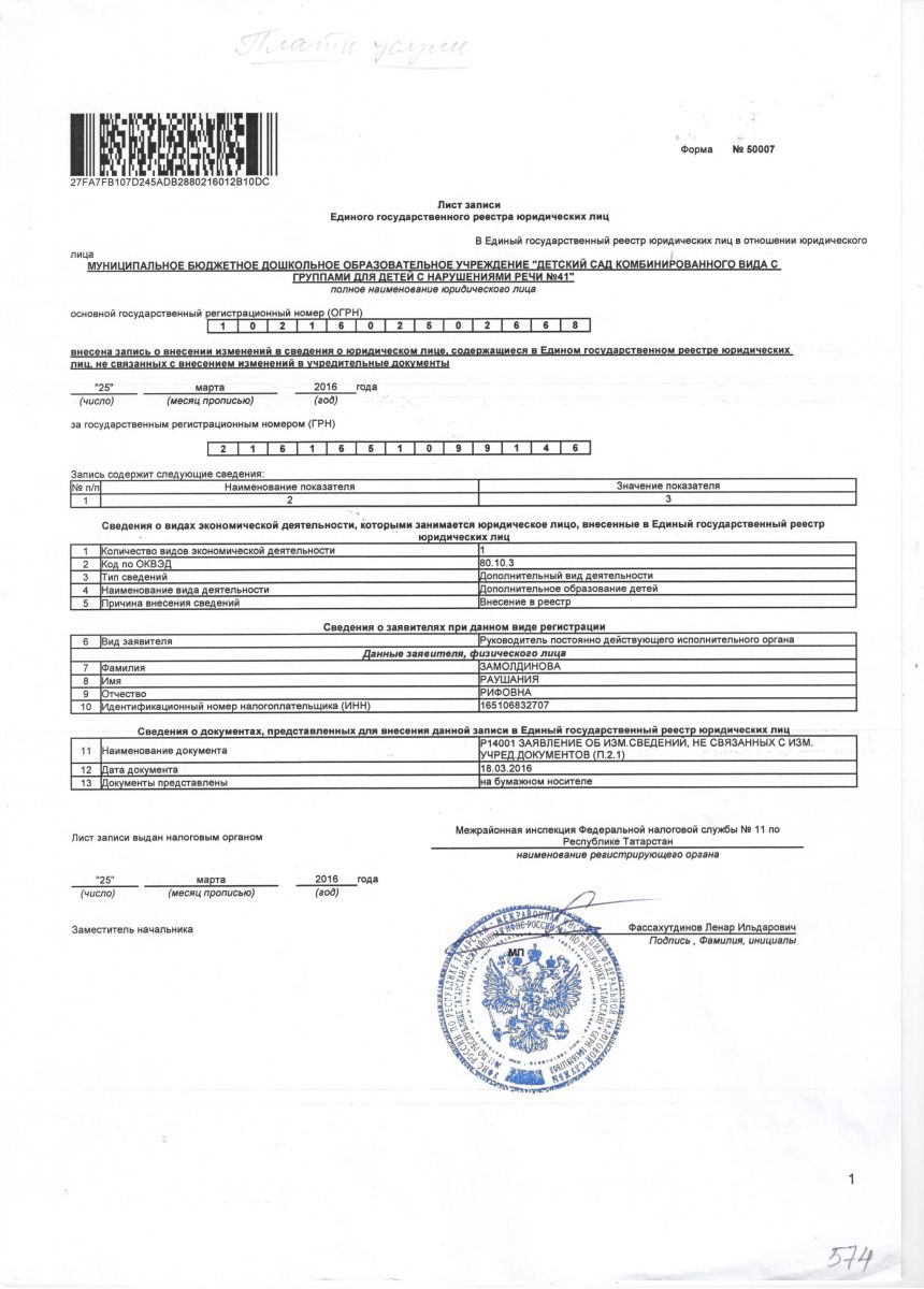 Лист записи ЕГРЮЛ на дополнительное образование детей
