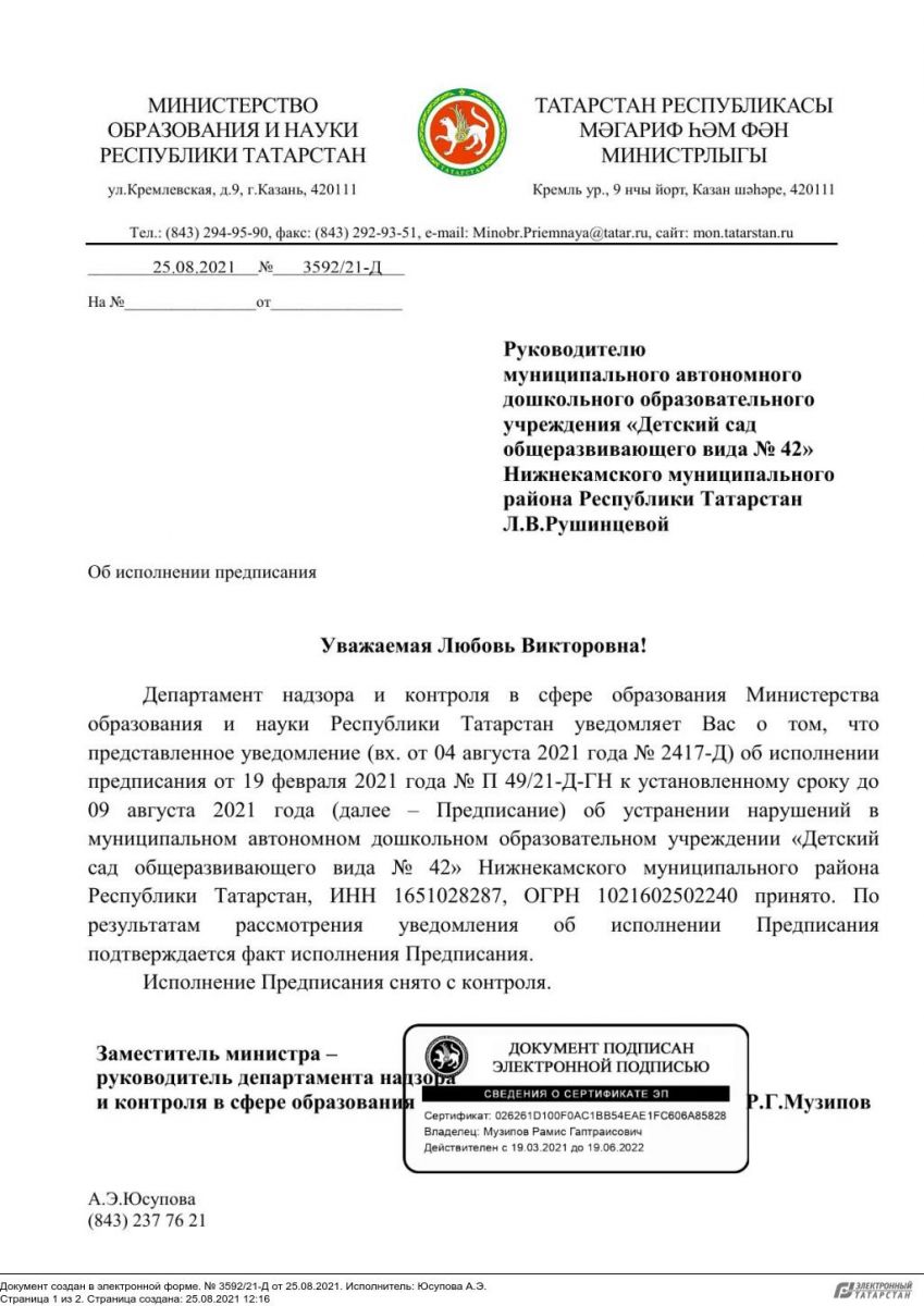 Уведомление №3592/21-Д от 25.08.2021 об исполнении предписания № П 49/21-Д-ГН от 19.02.2021г.
