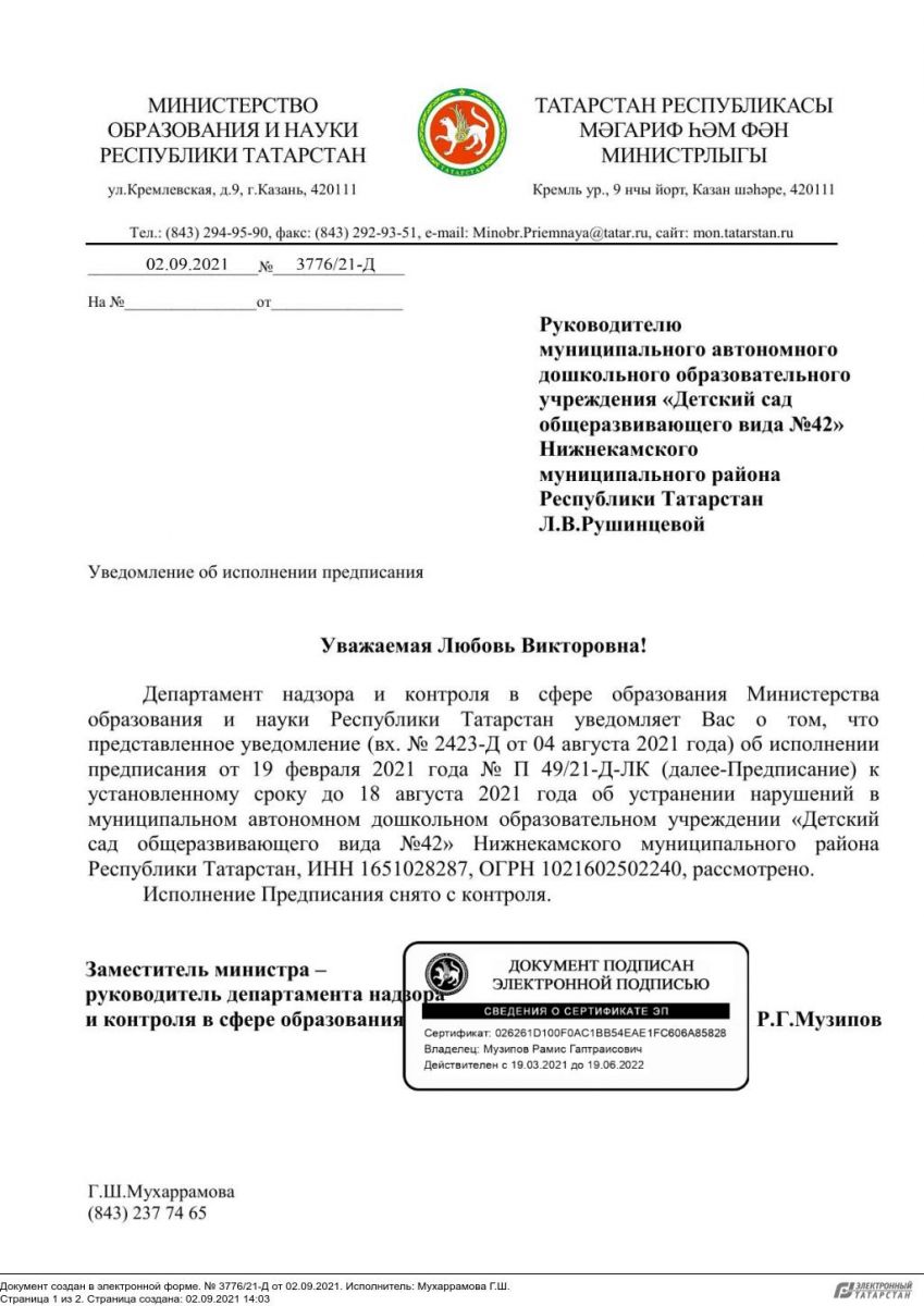 Уведомление №3776 от 02.09.2021 об исполнении предписания №П 49/21-Д-ЛК от 19.02.2021г.