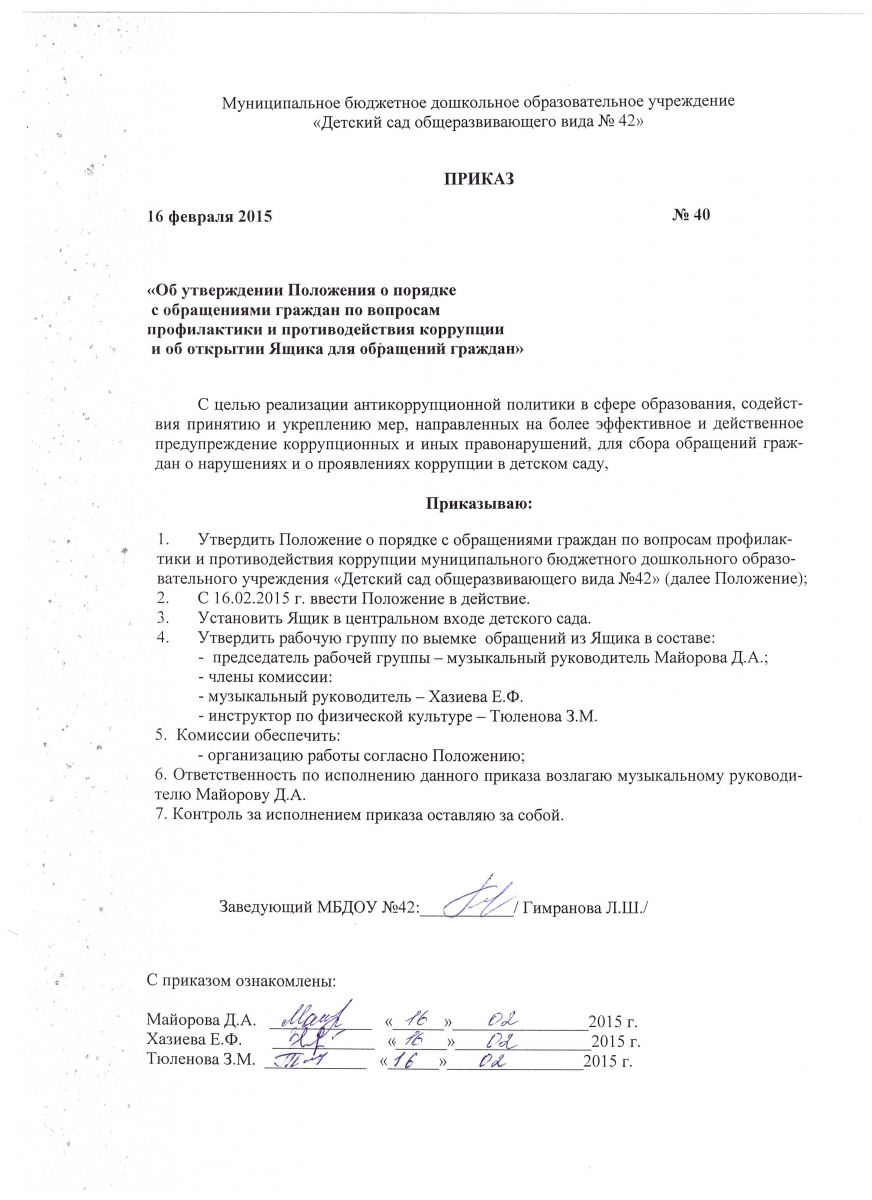Приказ об утверждении Положения о порядке работы с обращениями граждан по вопросам профилактики и противодействия коррупции и об открытии ящика для обращений граждан