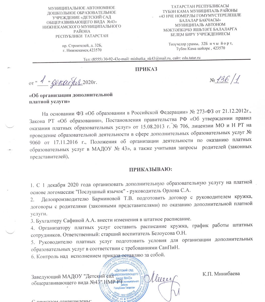 Приказ об организации дополнительной платной услуги (логомассаж)
