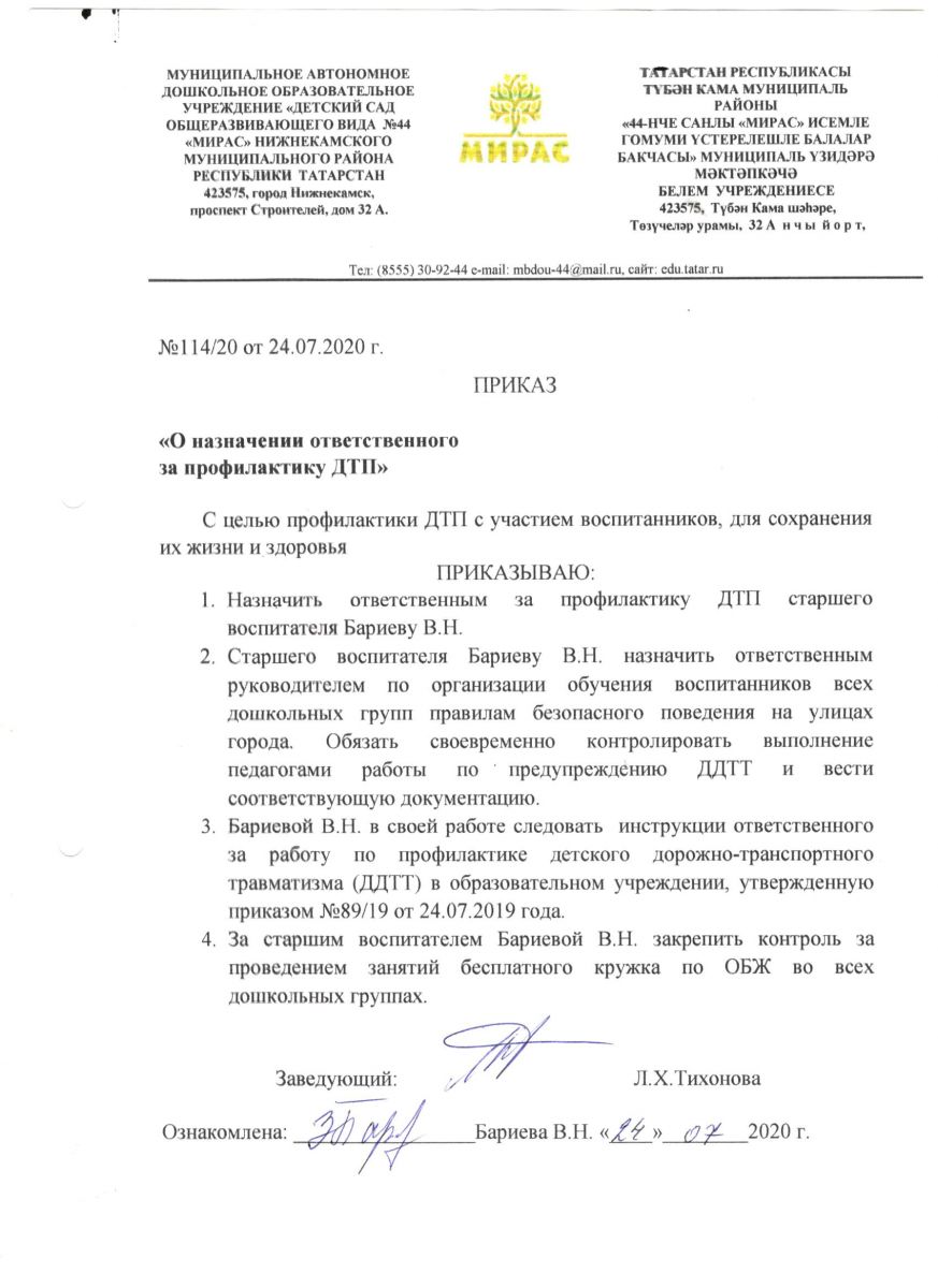 Приказ о назначении ответственного за работу по профилактике ДТП