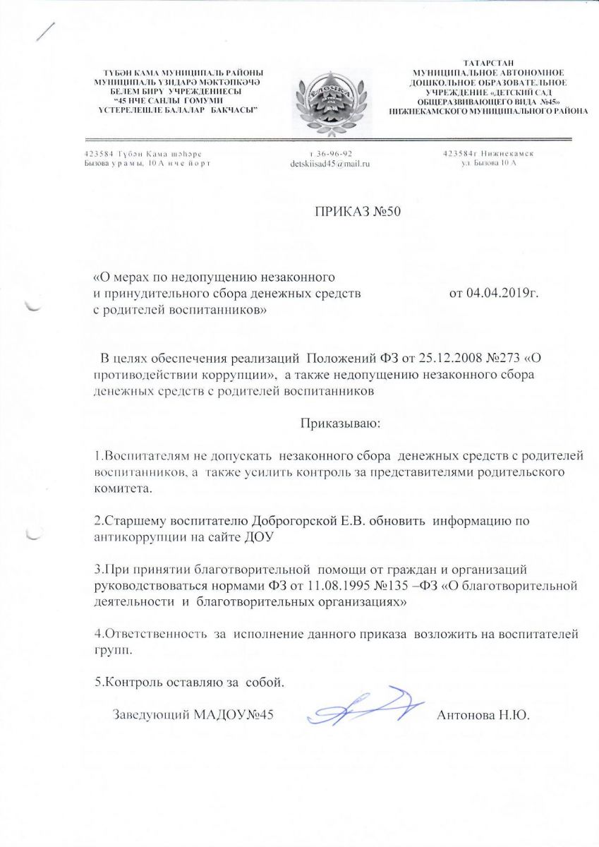 - Приказ по ДОУ о недопущении денежных средств с родителей 2019 год