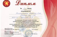 Поздравляем воспитанницу группы № 7 Калимуллину Амелию и воспитателя Зарипову А.Р. за участие и победу во Всероссийском конкурсе детско-юношеского творчества по пожарной безопасности приуроченнное к 25 летию создания МЧС России и 20-летию МЧС Республики Татарстан в номинации "Самый юный участник художественно- изобразительного творчества . Они награждены Дипломом I степени. Мы желаем новых творческих успехоПоздравляем воспитанницу группы № 7 Калимуллину Амелию и воспитателя Зарипову А.Р. за участие и победу во Всероссийском конкурсе детско-юношеского творчества по пожарной безопасности приуроченнное к 25 летию создания МЧС России и 20-летию МЧС Республики Татарстан в номинации "Самый юный участник художественно- изобразительного творчества . Они награждены Дипломом I степени. Мы желаем новых творческих успехов, плодотворную совместную работу. в, плодотворную совместную работу.