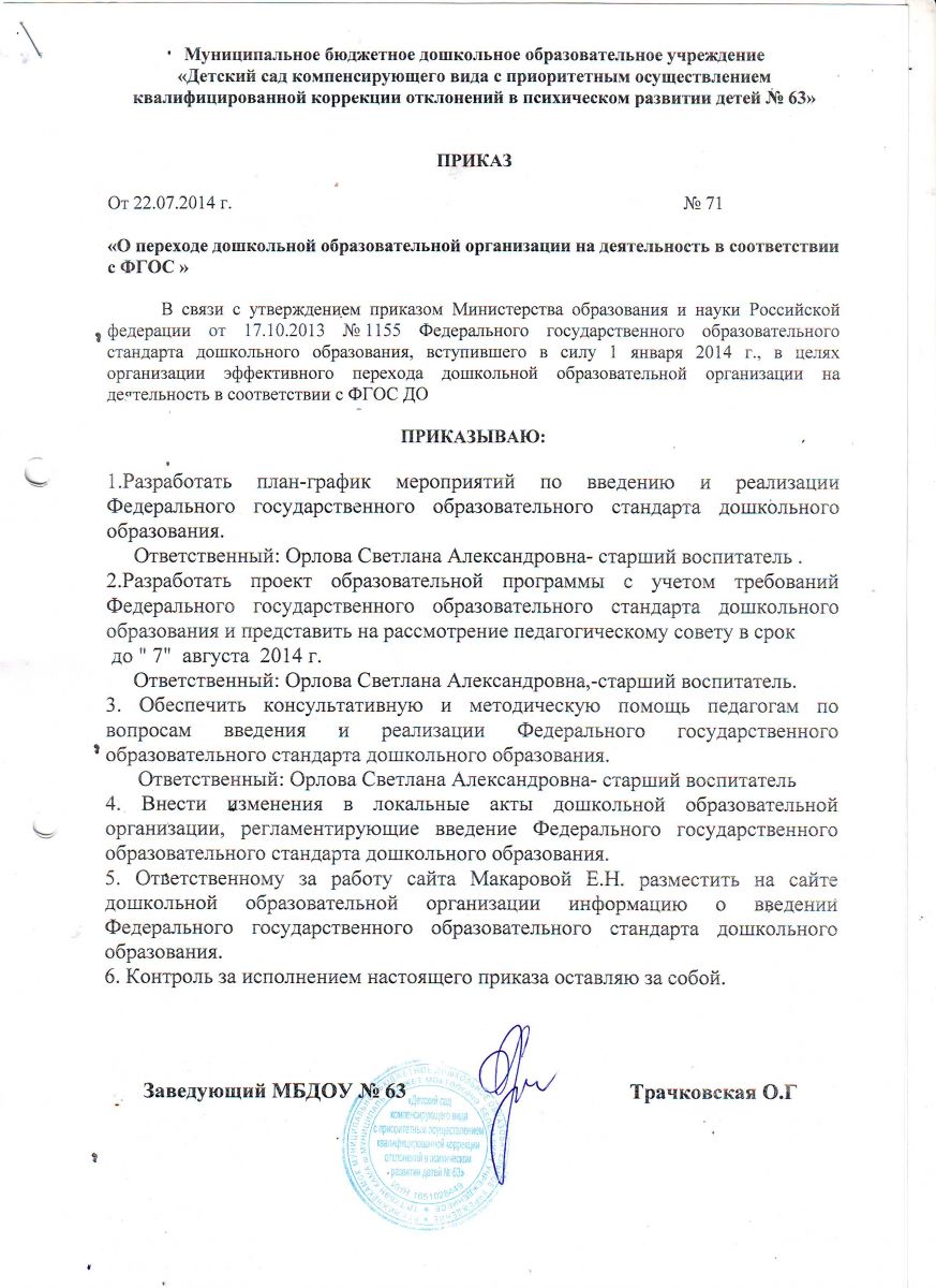 Приказ о переходе ДОО № 63 на деятельность в соответствии с ФГОС