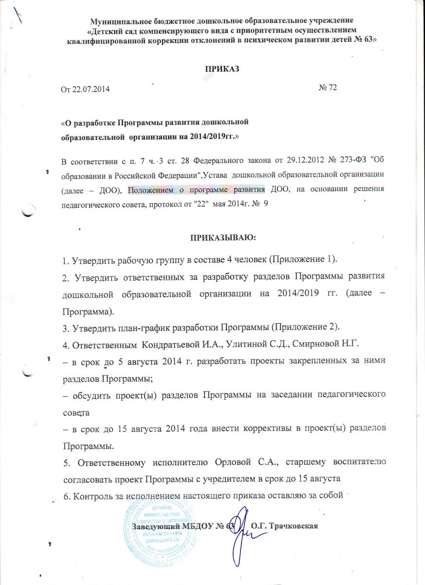 Приказ о разработке программы развития ДОО№ 63