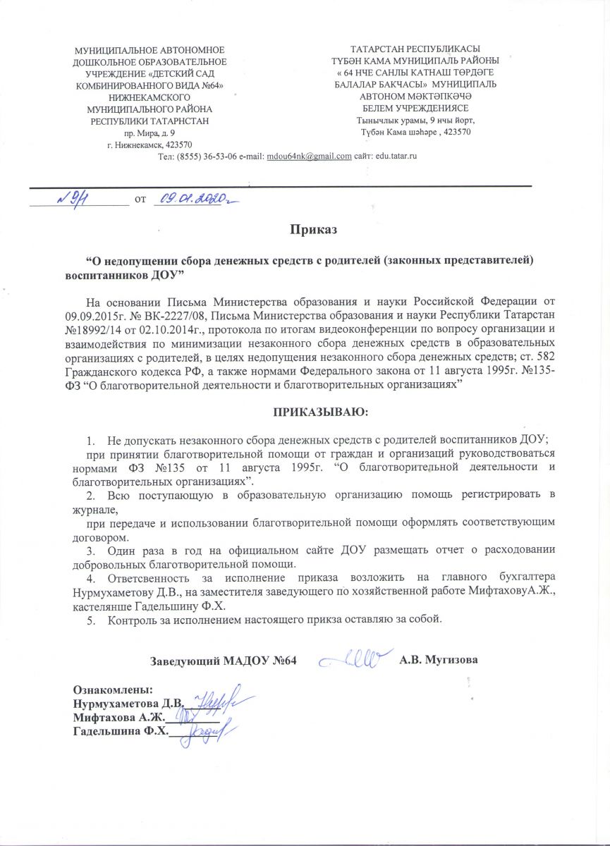 Приказ о недопущении сбора денежных средств с родителей 2020