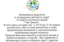 Накануне Всемирной акции "Час Земли" волонтёры "Помогаторы" провели мероприятие с просветительской целью. Юные добровольцы говорили воспитанникам и их родителям об акции, предлагали участвовать в ней, раздавали листовки, изготовленные детьми 10 группы. Рассказывали, как человек может помочь сохранить природу и природные ресурсы, приглашали поиграть в игры экологической направленности. Так, мамы и папы по описанию угадывали животных, проходили по экотропе. Уважаемые родители и подписчики нашего сообщества, 30.03.24 с 20.30 до 21.30. Выключите свет на один час и проведите время с семьёй без телефонов и телевизора!